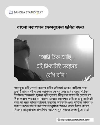 ফেসবুকে ছবি পোস্ট করার সময় ক্যাপশন একটি গুরুত্বপূর্ণ উপাদান, যা ছবির সৌন্দর্য ও অর্থকে পূর্ণতা দেয়। বাংলা ক্যাপশন ফেসবুকের ছবির জন্য ব্যবহার করলে ভাষার আবেগ, ব্যক্তিত্বের প্রকাশ এবং দর্শকের সঙ্গে সংযোগ—সবকিছুই একসঙ্গে সম্ভব হয়। সঠিক শব্দচয়ন, সহজ ভাষা ও ব্যক্তিগত অনুভূতির সমন্বয়ে লেখা ক্যাপশন যে কোনো ছবিকে করে তুলতে পারে আরও অর্থবহ ও স্মরণীয়।