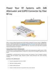 Flexi RF Inc is a pioneering force in the field of radio frequency coaxial product manufacturing. With an unwavering commitment to innovation and excellence, specializing in the research, development, and production of cutting-edge radio frequency and microwave components and parts. The company’s extensive product portfolio encompasses a wide range of products, including connectors, cable assemblies, attenuators, loads, amplifiers, power dividers, and other essential radio frequency and microwave devices and parts. Rapid response, innovative design, demanding quality standards, fast turnaround, value pricing, on-time delivery, and top-notch customer service are our main commitments to customers. With over 10 different product lines representing thousands of off-the-shelf and custom models, Flexi RF offers the world's largest variety of over 10,000 RF products.